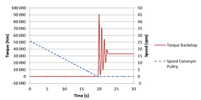 In the example, a load torque ML of 650,000 Nm is applied to the conveyor pulley. In the initial state, the pulley turns at a nominal speed of 26 rpm while all other rotating parts turn at a speed according to the gear ratios. Figure 4 shows the calculated braking of the drum and the resulting load in the BS: The speed of the conveyor pulley slowly falls from the nominal speed back to 0 rpm, and the BS must hold the load after 19 seconds. It is hereby subject to a peak torque of 91,000 Nm. The system “pulses” three to four times before it stands and the BS holds the nominal torque of the load torque ML. In this example, the ratio between peak and nominal torque is 2.75. The peak torque depends on the stiffness of all components. (It can be greater if Elastomer clutches or other non-linear components are installed.)
